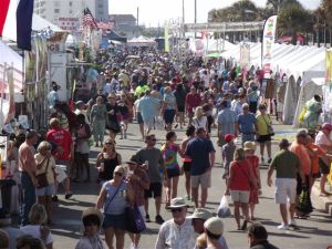 Each October, about 300,000 visitors stroll the Gulf Shores public beach boardwalk during the National Shrimp Festival. Participants come to sample seafood, view artwork and listen to music.